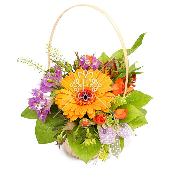 гербера жёлтая – 1 шт., роза кустовая оранжевая – 1 шт., альстромерия сиреневая – 1 шт., альстромерия красная – 1 шт., декоративная зелень, оазис, корзина малая, лента. На фото.